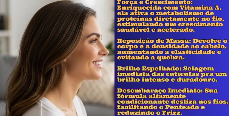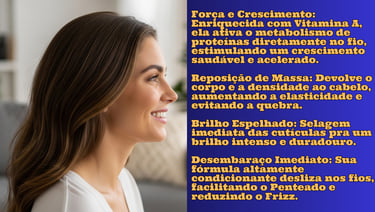 Vitamina A Poderosa. Rica em vitamina A, essencial pra regeneração celular e crescimento saudável dos fios.